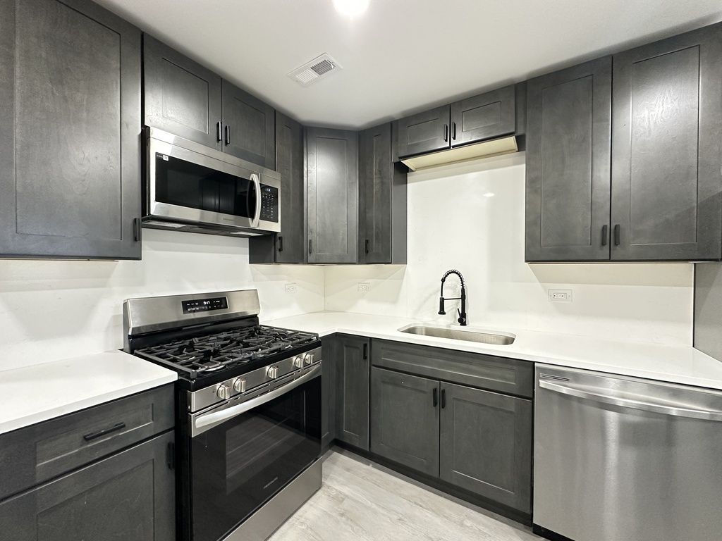 Drop dead gorgeous two bedroom, one bathroom in East Village features rehabbed eat in kitchen with quartz countertops, stainless steel appliances, dishwasher, microwave, large living room, hardwood floors, spacious bedrooms, great closet space, rehabbed bathroom, central heat and air, in unit laundry, and small pets are welcome! Short walk to Grand Avenue Metra Station.