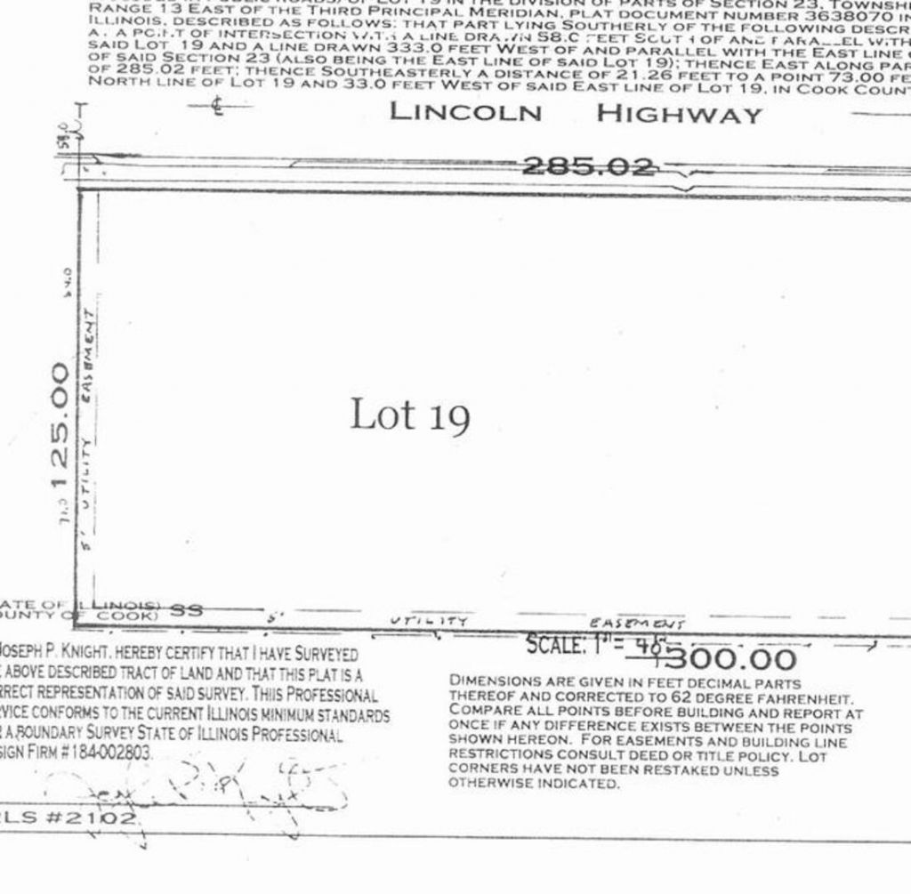 For Sale, Ground Lease or Build to Suit. The 37,386sf site is located on the SWC of US Route 30 & Main Street. It has approximately 300ft of frontage on Rt 30 and approximately 125 ft of frontage on Main Street. C-5 zoning makes the site ideal for many different development ideas - retail, office, restaurant, car wash, gas station, and a variety of other uses. The site is one block west of the Metra Train Station. The area is densely populated. The Route 30 corridor is comprised of many retail and service businesses. Pete's Fresh Market is a few blocks west of the site along with many other national and regional businesses along Route 30. To the immediate south of the property is a residential subdivision with mid-scale homes. To the north is the village of Olympia Fields which is comprised of many upscale single-family residences.